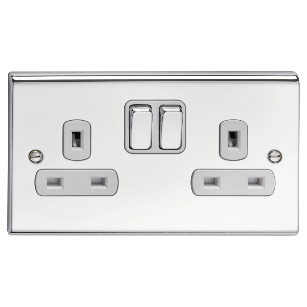 Deta Socket 2 Gang Double Pole Switched 13A Chrome White Insert