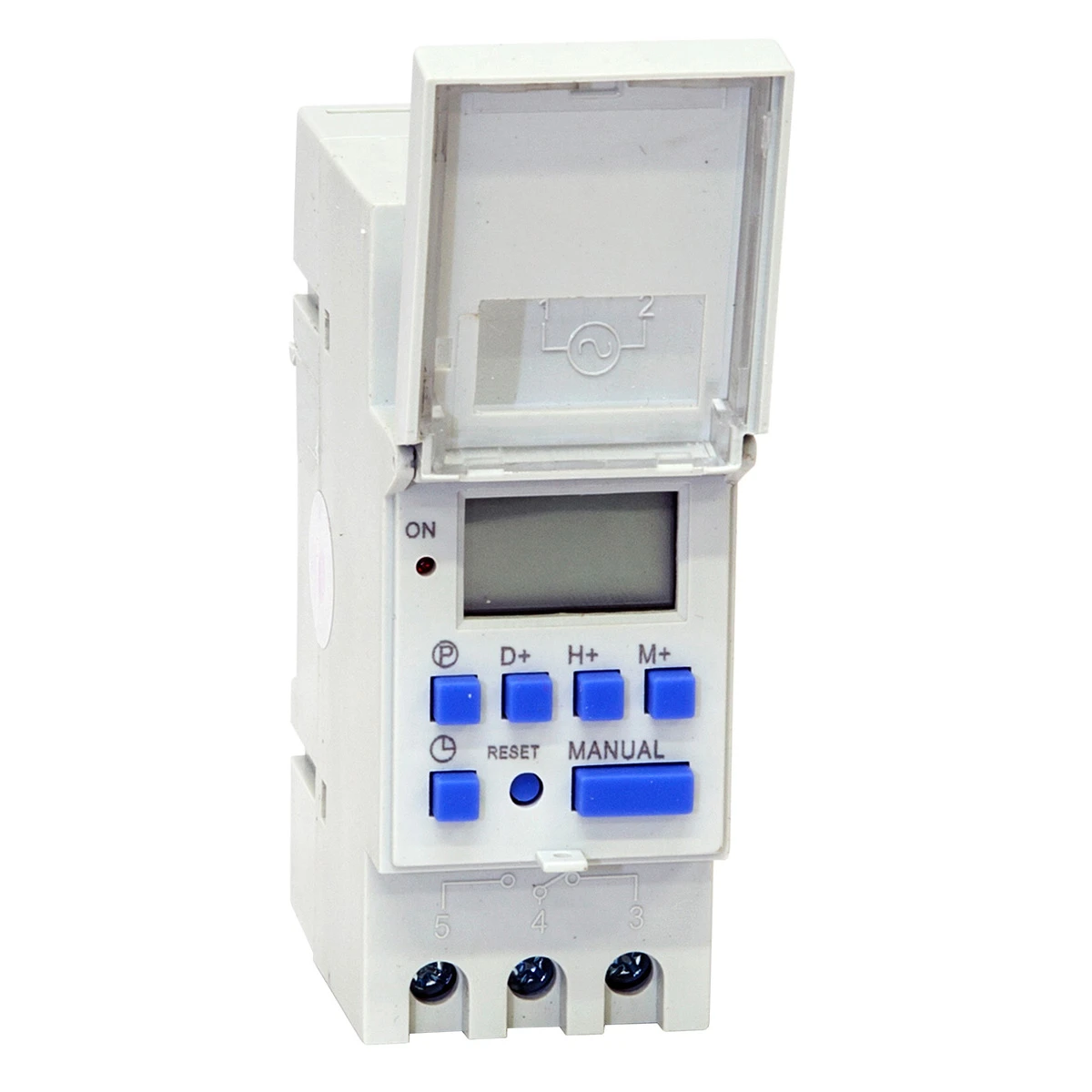 A digital time switch with 7 day function, 1 channel, 150hr reserve battery. 8 on / 8 off programmable timer settings. Suitable for housing within Steeple or Lewden consumer unit range or modular enclosures. · · · 4 Pole · · 16A · · Din Rail mounting · · 7 Day function · · 150 hour battery back up · · 8 on / 8 off programmable timer settings · · 4mm² of max cable capacity