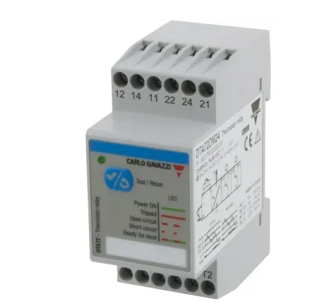 DTA72 is a motor thermistor monitoring relay. Through the motor internal PTC or PTCs the DTA detects when one or more motor windings are exceeding the maximum operating winding temperature. The PTC type installed in the motor is different according to the motor insulation temperature. The temperature triggering threshold is detemined by the PTC Type. DTA72 is equipped with 2 outputs which operate in a complementary mode. It can be set to operate as MANUAL or AUTO reset. · · · High operating safety · · Save time and costs · · Ensure continuous production process in your plant · · Low profile DIN rail mounting · · Two outputs. The 2 ouputs provide, besides interrupting the motor supply, an additional signal for a lamp, PC or PLC. · · Bi-colour front LED. It provides indications about alarm status and alarm discrimination