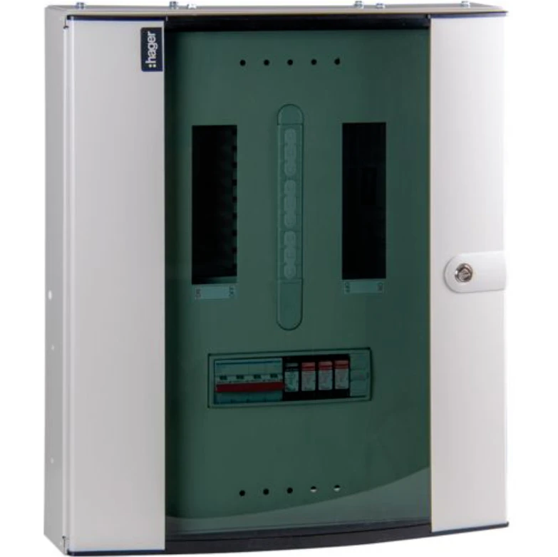 Hager Invicta 3 surface mounted steel Distribution Enclosure features IP3XD rated, comes with a glass door. Fully shrouded copper busbar, rated 25kA short circuit conditional current. Supplied with factory fitted SPD Type 2 & 4 Pole Switch Disconnector incomer · · · 8 Way · · Triple Pole + Neutral · · Factory fitted SPD Type 2 & 4 Pole SD incomer · · Incoming cable sizes: 125A & 100A 50mm, 63A 16mm · · A JK101SE may be required to provide additional incoming cable space · · IP3XD rated · · Conforms to BS EN 61439-3