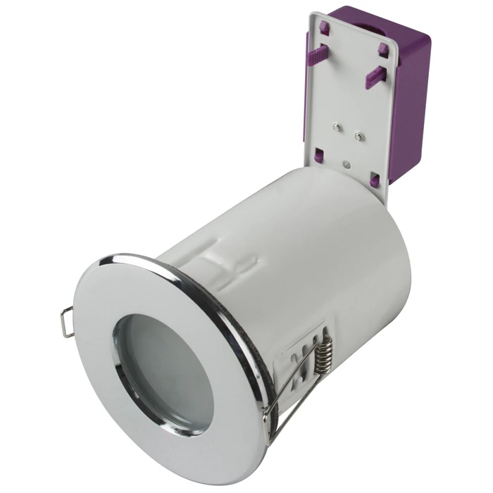 STARLING 50W mains voltage steel fire rated shower downlight · · · Suitable for offices, retails shops, reception areas, hotels, restaurants, bars and clubs, showrooms · · Recessed downlights with pressed steel body and front bezel · · Fitting design and itumesent seals retain the integrity of 30, 60, 90 minute fire rated ceiling/floor constructions · · IP65 · · Complies with BS476 Part 21 · · Complies with dichroic and aluminum lamp types · · Class 1 Construction · · Compatible with GU10 Halogen and some other LED fittings”