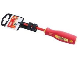 VDE approved fully insulated soft grip plain slot screwdrivers tested to 10kV, suitable for working on live circuits up to 1kV AC and 1.5kV DC. Made from hardened, tempered and chemically blacked S2 steel. on individual storage hanger. · · · Fully insulated soft grip handle with deep set blade sheath for total safety · · Tested to 10kV, suitable for working on live circuits up to 1kV AC and 1.5kV DC · · Conforms to EN 60900, DIN 7437 and 7438 · · Made from hardened, tempered and chemically blacked S2 steel · · Chemically blacked S2 steel · · Fully insulated soft grip plain slot screwdrivers