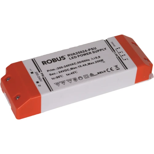 VEGAS 250W, 24V, IP20 constant voltage driver, non dimmable · · · IP20 for indoor applications only · · Constant voltage driver for use with 24V VEGAS strip range only · · Non dimmable · · Maximum 26m total length of strip that can be connected in parallel” · · 250 Total Power (W) · · White/Orange colour