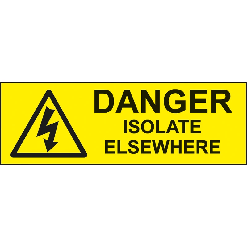 This is a Newlec SAV warning label displaying “Danger Isolate Elsewhere” in Black and Yellow. · · · Fully weatherproof · · Ideal for internal or external application · · RPSA = Rigid plastic self adhesive · · SAV = Self adhesive vinyl · · Products compliant to BS 5499 (Safety Sign Regulations) · · Products conform to IEE Wiring Regulations BS 7671 (2001)