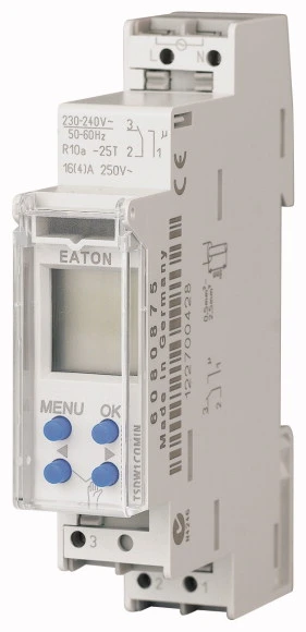 Series connection digital time switch with quick fastening, text-oriented operator prompting in the display, width 17.5 mm, 10 years autonomy and programmed DST setting, day and week program, duoFix plug-in terminals, OBELISK interface for PC programming, 56 memory locations shortest changeover time 1 min., pushbutton summer/winter time, continuous switch ON/OFF/AUTO, switching preselection, 1 channel 1 changeover contacts 16A/250V. · · · Mounting method DIN rail · · Supply voltage 230 – 240V · · Voltage type of supply voltage AC · · Frequency supply voltage 50 – 60Hz