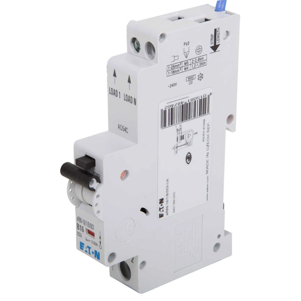 Technical Specifications  Technical Specifications Earth leakage circuit breaker/RCBO Tripping characteristic (type/curve) B Disconnection characteristic Undelayed Frequency 50/60 Hz Degree of protection (IP rating) IP20 Voltage type AC Leakage current type AC Recess depth 69.5 mm Rated current 6 A Rated voltage 240 V Over voltage category 3 Power loss 2.3 W Rated short-circuit breaking capacity IEC 60947-2 0 kA Current limiting class 3 Number of protected poles 1 Pollution degree 2 Number of poles (total) 1 Rated impulse-withstand voltage (Uimp) 4 kV Rated short-circuit breaking capacity according to EN 61009 6 kA Rated short-circuit breaking capacity Icn according to EN 61009-1 6 kA Width in number of modular spacings 1 Rated insulation voltage Ui 500 V Rated fault current 0.03 A Surge current capacity 0.25 kA Connectable conductor cross section solid-core 1 – 25 mm² Connectable conductor cross section multi-wired 1 – 25 mm² Ambient temperature during operating -25 – 40 °C Concurrently switching N-neutral No With interlocking device No Anti-nuisance tripping version No · Technical Data Sheet – Click to Download