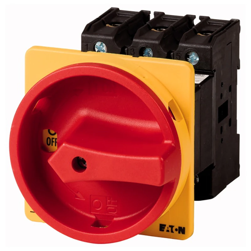 Eaton Main switch P3 63 A rear mounting 3 pole Emergency switching off function With red rotary handle and yellow locking ring Lockable in the 0 (Off) position