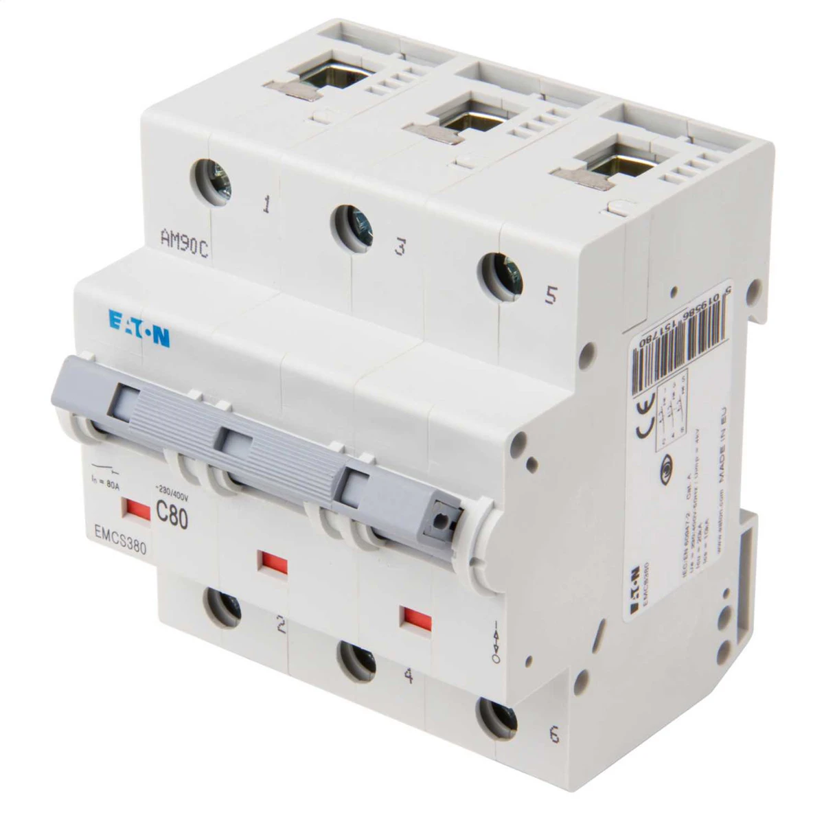 EM miniature circuit-breaker, 3 pole, trip type: C, rated operational current In: 80 A, rated switching capacity according to IEC/EN 60947-2: 20 kA, switchgear for residential and non-residential applications · · · DIN rail mountable and suitable for use with both pin and comb type busbar systems · · Designed & tested in accordance with IEC 60898 & IEC 60947-2 · · Suitable for 230/400 VAC systems and are calibrated for use at 40°C · · Fitted with box clamp terminals suitable for use with cables up to 25mm2 · · Suites with the other modular devices including RCBOs, RCCBs and isolators · · Positive contact is flag indicator · · Operating temperature -25 to 55 °C · · Impulse withstand voltage 4kV · · Certified by KEMA · · Box clamp barrier to prevent incorrect cable insertion