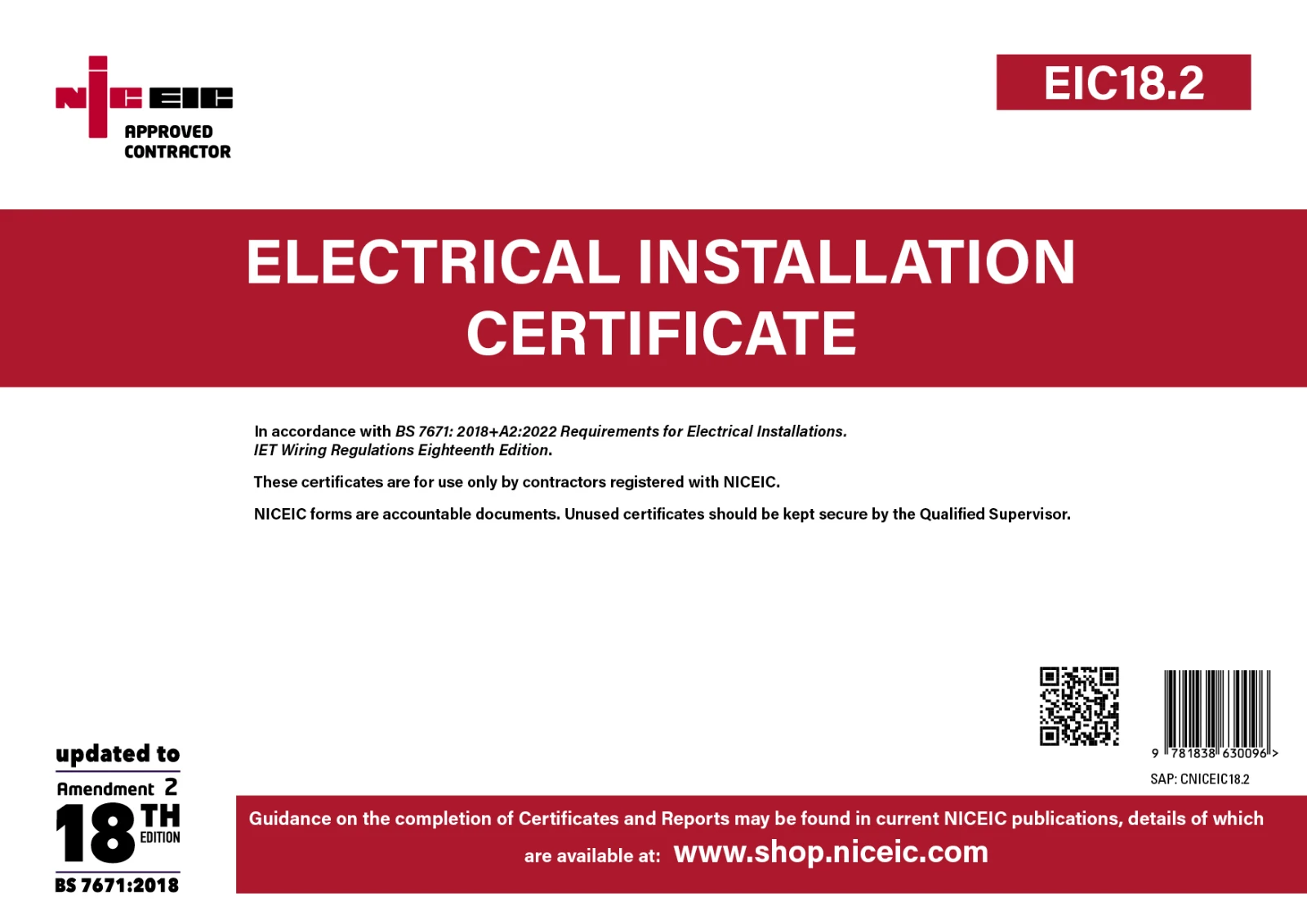 The NICEIC Electrical Installation Certificate is to be used for the initial certification of a new installation, or new work associated with an addition or alteration to an existing installation, including the replacement of a distribution board (or consumer unit), carried out in accordance with BS 7671: 2018+A2:2022. · · · It provides information and guidance relating to the design, construction, inspection, testing and certification of domestic electrical installation work · · intended to promote good practice and aid understanding of the fundamental concepts of protection for safety. · · Provides official documentation of the safety and compliance of an electrical installation