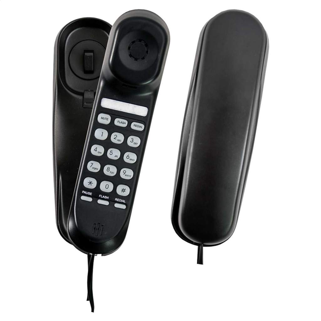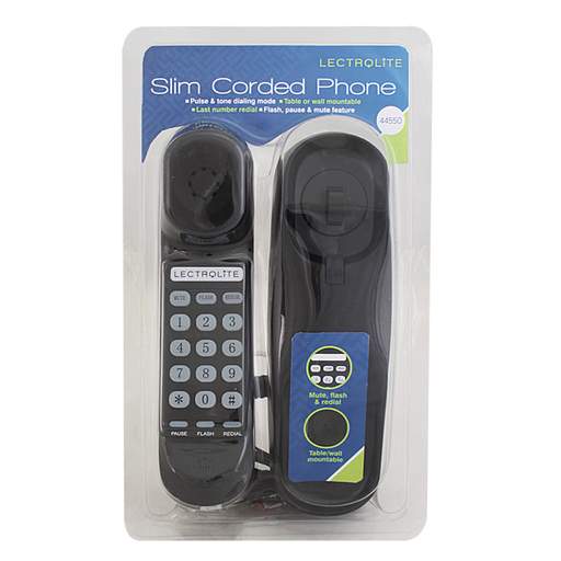 Slimline telephone | Last number redial | Table top or wall mounted | Corded | Buttons on handset | May come blister packed/boxed