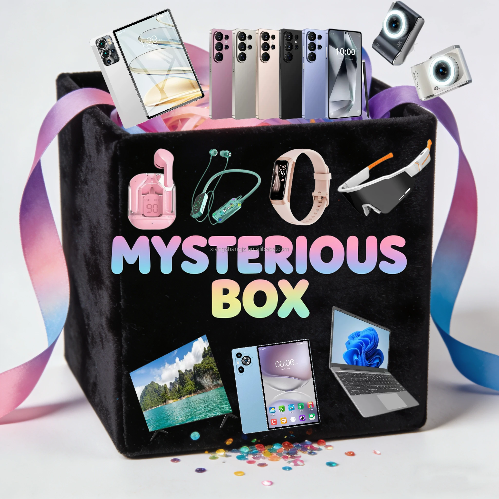 Super Blind Box (must have 5 items) 1. Blind Box Content: The box may contain mobile phone, speakers, VR glasses, game console, headphones, smart watch, camera, cable, phone stand, etc. Most of the products are electronic, with a small portion being household accessories.