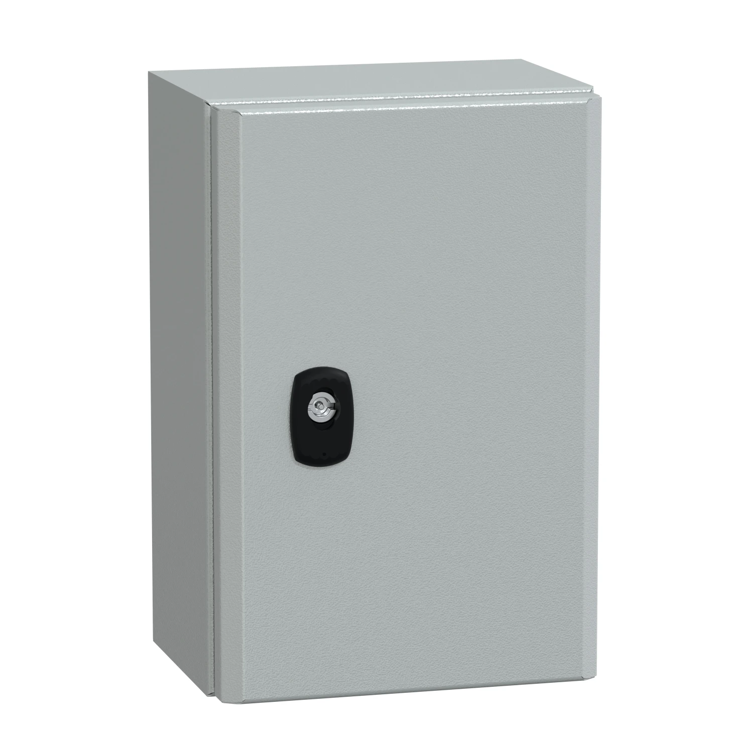 Spacial S3D wall mounted steel enclosure with plain door. 300 x 300 x 150 mm. Single piece body, mounting plate included. 3 mm double bar lock insert. Steel made, epoxy-polyester powder finish. Protection IP 66, IK10, Grey RAL 7035. · · · One-piece folded and welded body, double plate thickness gutter shaped front profile · · Flat rear panel · · Degree of protection: IP 66 for all single door enclosures, IP 55 for double door enclosures · · A light and resistant enclosure with folded cross structure sheet steel · · External mechanical impact resistance: IK 10 for enclosures with plain door, IK 08 for enclosures with glazed door · · Time saving : 54 dimensions with or without plain chassis, customized offer, wide range of accessories · · Wide range of sizes : from 300x200x150 to 1400x1000x300 · · Choice : plain door or glazed door · · Paint finish : colour grey RAL 7035 · · Certifications : EN 62208 (LCIE), UL, CUL, BV, DNV, LR, GL, ATEX (modified enclosure)