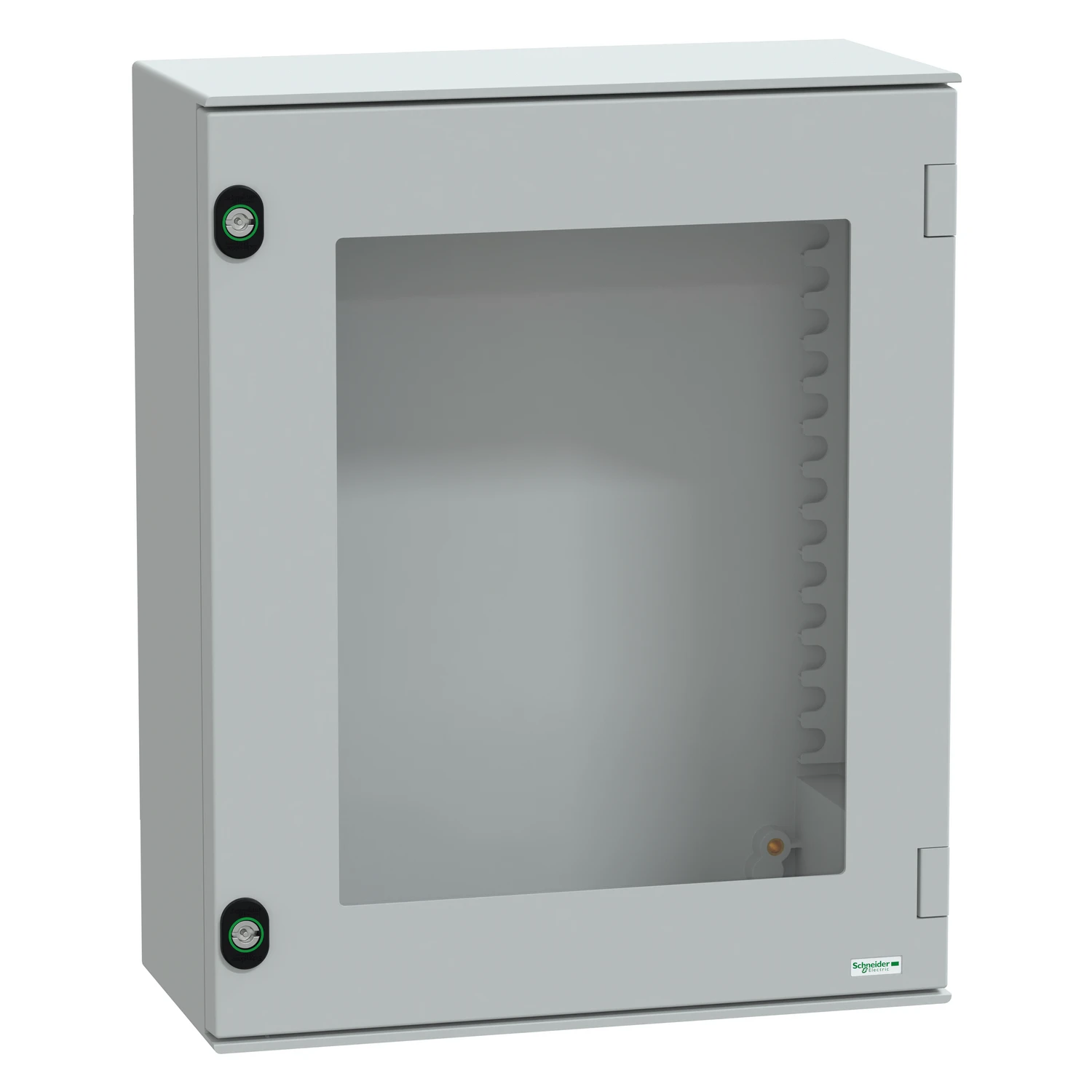 Wall-mounting enclosure polyester monobloc IP66 H530xW430xD200mm glazed door. range: Thalassa – product name: Thalassa PLM – device short name: PLM – device application: multi-purpose – product or component type: compact enclosure – enclosure nominal height: 530 mm – enclosure nominal width: 430 mm – enclosure nominal depth: 200 mm – device composition: body 1, door 1, lock 2 – body type: built-in canopy, one piece moulded with notches in the rear – door type: transparent – lock type: 3 mm double-bar lock. · · · Thalassa PLM wall-mounting polyester enclosure with glazed door. · · 529 x 430 x 200 mm. · · Without mounting plate, built-in canopy. · · 2 points door locking system with 3-mm double-bar locks. · · Polyester reinforced with fibreglass body. · · Protection IP 66, IK08, Grey RAL 7035. · · Operating frequency: 50 – 60Hz · · Tightening torque: 0.8 – 1.2Nm/ 2 – 2.5Nm · · Ambient operating temperature: -40°C to 70°C · · IP20 Degree of protection