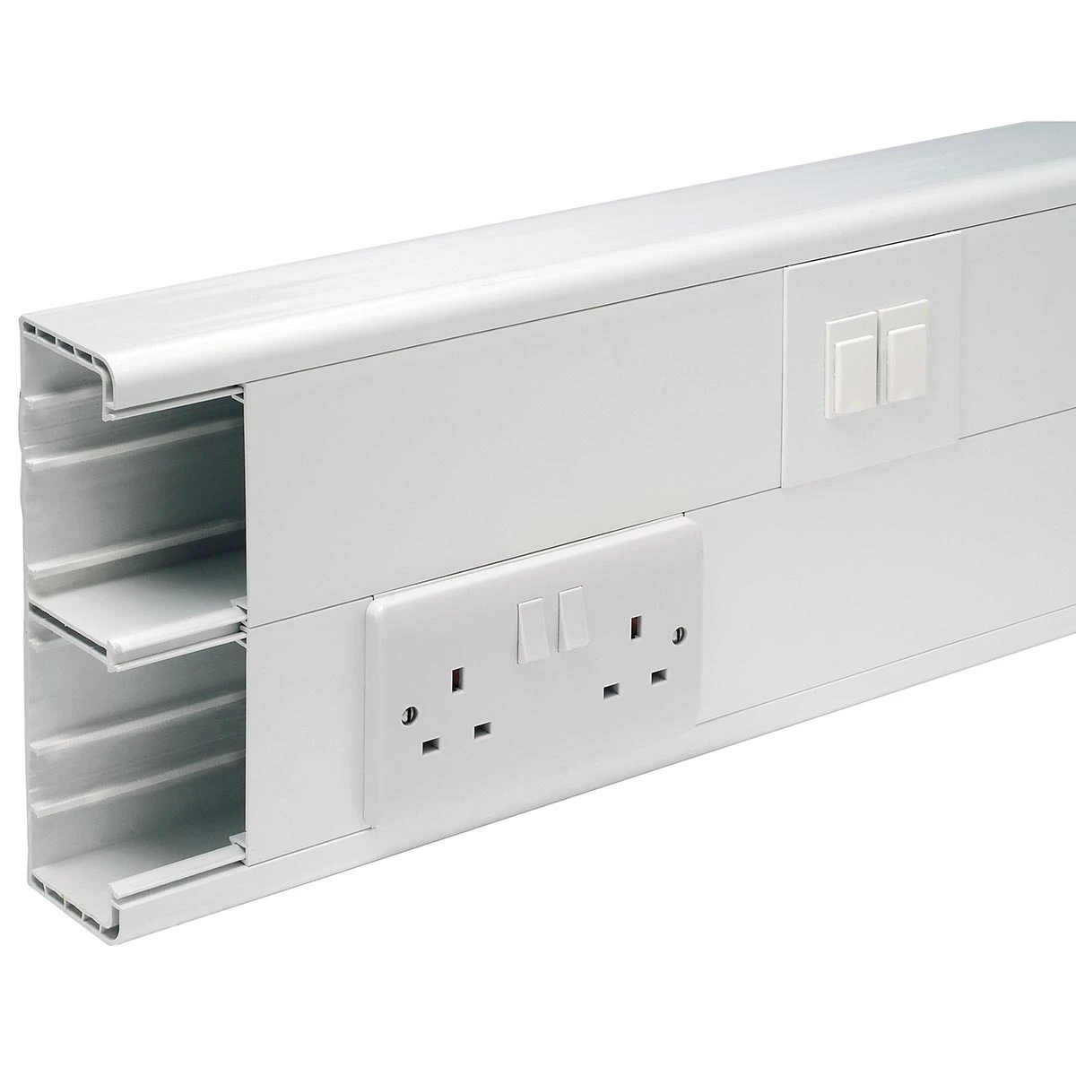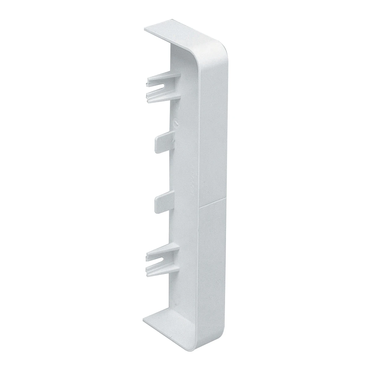 End caps made up of a white polyvinyl chloride (PVC) housing body, designed to accommodate a range of wiring accessories and for protecting cables and provide space for other electrical equipment. · · · Durable and impact resistant · · Easy to install · · Right hand side applicable · · Includes a range of clip-on fittings with built-in overlaps · · All fittings are polycarbonate · · Aluminium systems specified with polycarbonate fittings meet accepted requirements for LS0H · · Compliant up to Cat 7a · · 50mm bend radius fittings