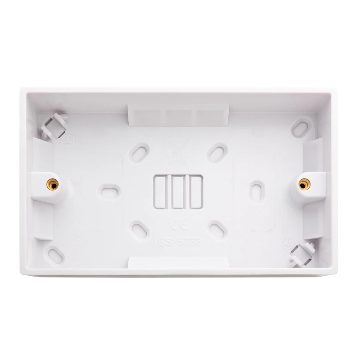 The 11P228 2 Gang 28mm pattress Surface Back Box is from the Denmans Essentials range of Wiring Accessories, boasting a clean white and durable square edge design to suit any domestic or light commercial application. · · · Traditional square edge profile design to suit any application · · Durable and long lasting backed by a 25 year guarantee · · Certified to ASTA:BEAB, Intertek and HKSTC standards · · Fully adjustable with large fixing points · · Supports surface mounting method · · 2 Gang · · 28mm depth · · Top entry suitable for mini-trunking