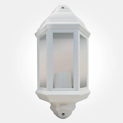 A stylish Half Lantern style fitting with an integrated sensor · · · Requires 1 x suitable ES lamp (not included). Fitting is rated at 60W max · · This luminaire is compatible with bulbs of the energy classes: A++ to E · · Polycarbonate construction: corrosion resistant · · One piece lens: quick and easy assembly · · 12 metre max detection range · · Time on 3 minutes ± 20 sec · · 120º detection zone · · Factory preset PIR – no override facility · · White Body