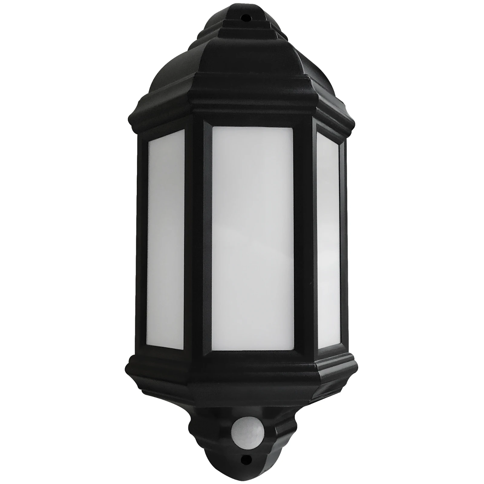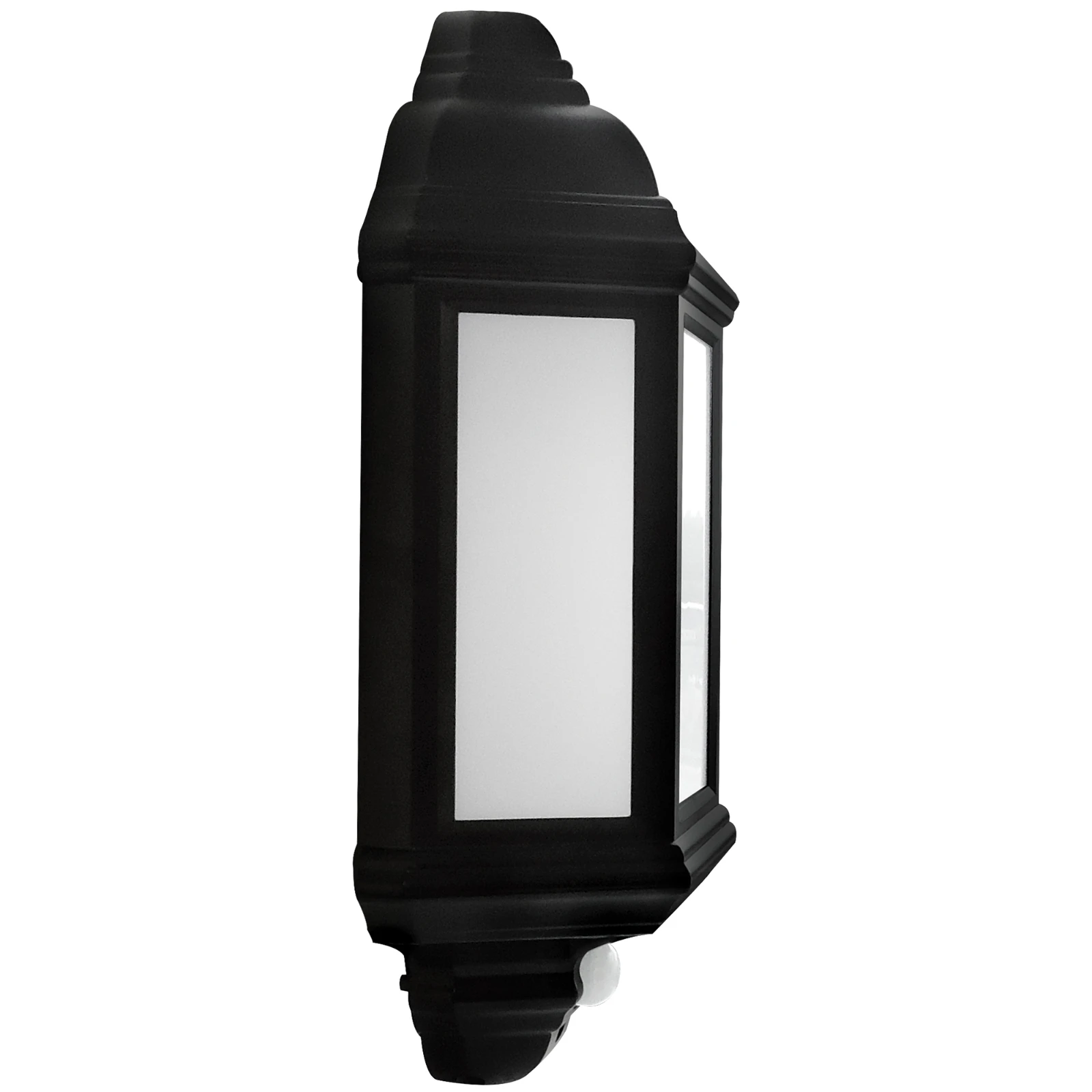 7W LED half lantern with 120° PIR -Energy efficient LED alternative to traditional lanterns · · · 7W, 420 Lumens, 35,000 hours average rated life · · Tough polycarbonate construction · · Time on adjustment 5 secs – 5 mins · · 120° detection angle · · 8 metre detection range