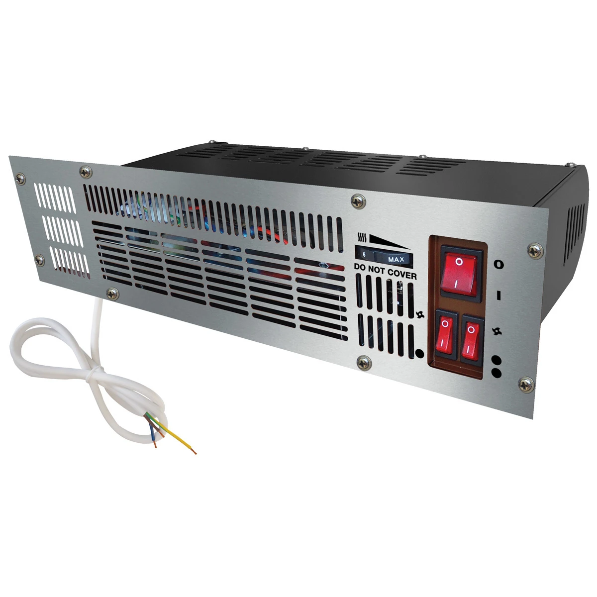 Plinth Fan Heater with 3 colour Facias of brown, white and stainless steel, it is pre-wired with 1.5m mains lead. · · · Three fascias included: brown, white & stainless steel: complete solution reducing stock requirements · · Thermostatically controlled with thermal cut out: controllable temperature point for economic operation · · Rubber feet: assist quiet operation · · Airflow 0.85m3/min · · Three settings for flexible heat output to suit room size: – 800W fan only operation – 1600W half heat and fan – 2400W full heat and fan · · Pre-wired with 1.5 metre of mains lead: Easy installation · · Three fascias included: brown, white & stainless steel · · IP20 Rated