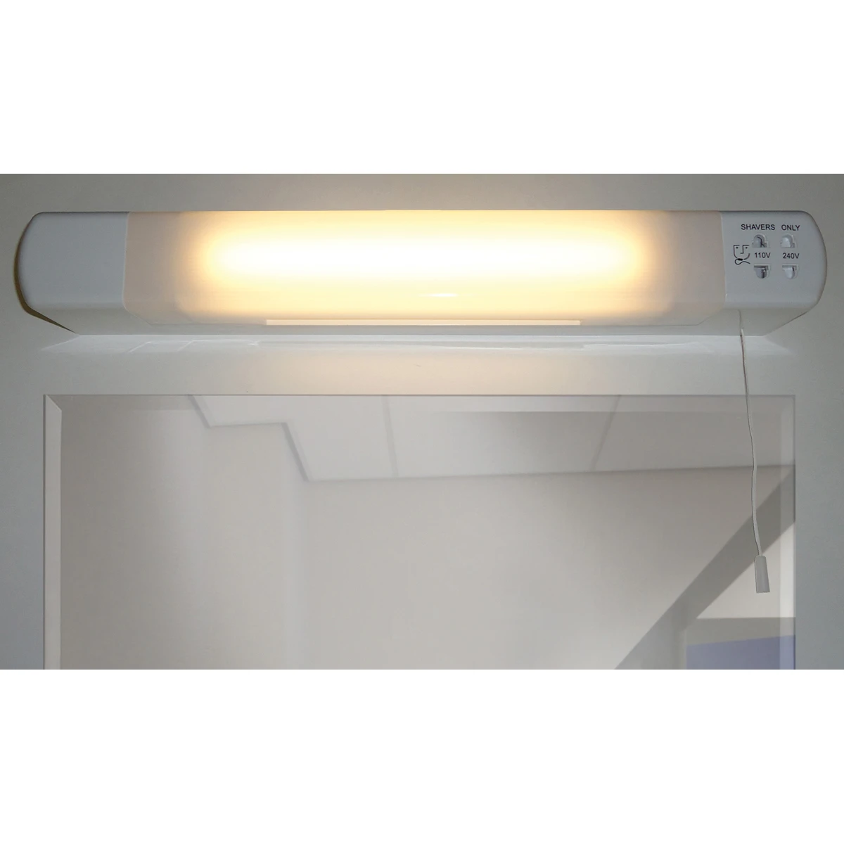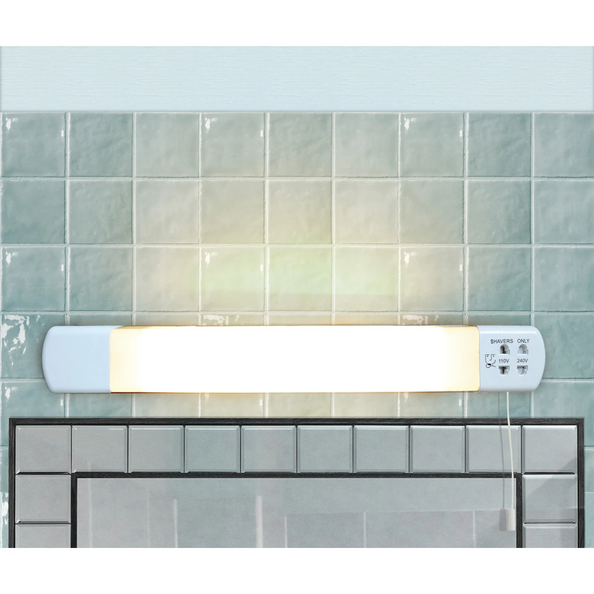 This 6W LED over mirror light fitting provides a pleasing light appearance with a built in permanent dual voltage shaver socket with a pull cord switch. It’s the perfect solution for long term performance in any modern bathroom to provide additional lighting and power in one unit. It is an energy efficient and a long life alternative to replace traditional fluorescent products. · · · 6W Rated · · Lumen rating: 400lm · · 3000K warm colour temperature: offering a pleasing light appearance · · Polycarbonate construction · · Requires 1 x S15 284mm double ended tubular lamp (included). Fitting is rated at 60W max · · This luminaire is compatible with bulbs of the energy classes: A+ to E and is sold with a bulb of the energy class: A+ · · IP20 Rated · · Can be used in Bathroom Zone 3 · · Safety isolating transformer: for bathroom use · · NOTE: the shaver socket will only operate when the light is switched on