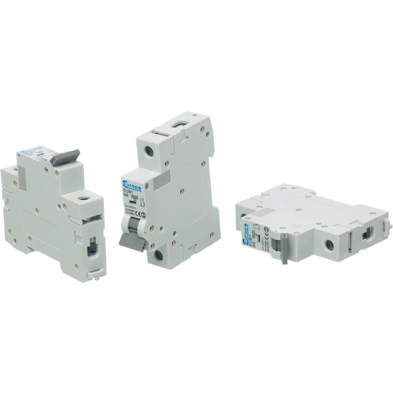 Europa EUB16B MCB SP B Curve 6A 6kA · · · Product: Circuit Breaker · · Type: MCB · · Pole Configuration: Single Pole (1P) · · Trip Type: Type B · · Short Circuit Rating: 6 kA · · Current Rating: 6 A · · CE Approved: Y · · Standards: EN 60898 SEMKO ROHS
