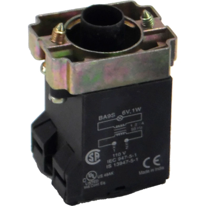 Collar transformer type 110v to 6v lamp holder (ba9 type) plus collar. · · · Easy installation · · Easy mounting · · Enhanced visual indication · · Includes mounting collar, Lamps not included · · NB: LP6 & LP7 lamp holders are suitable for use with, illuminated push buttons and selector switches