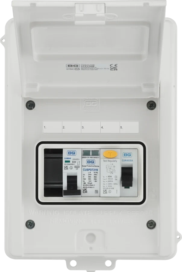 EV Consumer Unit in White with 5 modules including T2 SPD, 40A Type A RCD and 40A MCB
