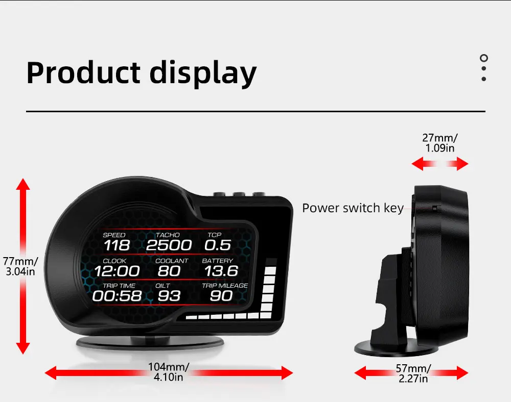 | Function | water temperature, Voltage Alarm, Fatigue Driving Alarm, Driving Time, Engine RPM, Driving Distance, Engine failure alarm, Average fuel consumption |