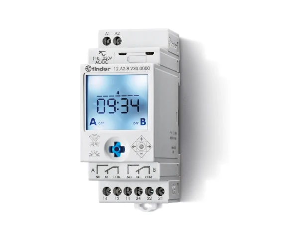 Type 12.A2 Weekly Astro time switches, 2 CO 16 A. ON/OFF and Pulse function. · · · 2 CO 16 A · · Weekly programming · · Functions: “Astro” ON, “Astro” OFF Switch ON, Switch OFF Pulse: 1s…59 min · · Can be programmed in “Classic” mode via the joystick, or “Smart” mode via smartphones with NFC communication · · Calculation of sunrise and sunset times through date, time and location coordinates · · Lock with a 4-digit PIN · · Back-light display · · Internal battery for set-up and programming without supply, easily replaceable from the front · · LCD status indication, set-up and programming · · 35 mm rail (EN 60715) mount