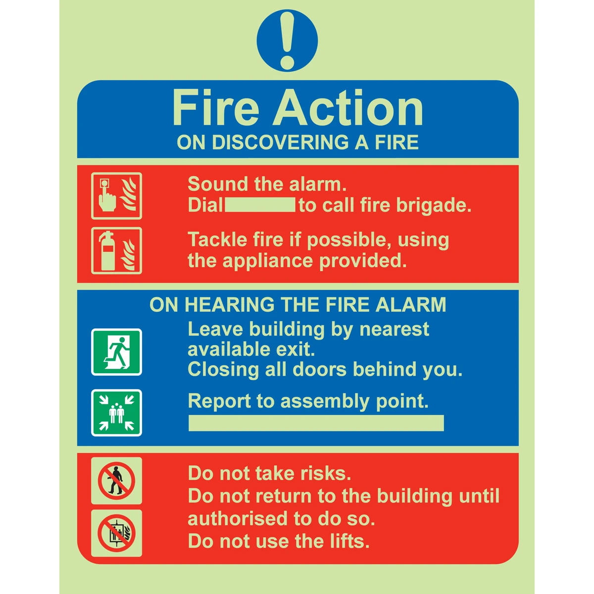 Health and safety sign with “Fire action” notice and instructions written in white on a blue/red background which conveys information on safety and safe conditions. This sign is designed to be visible during emergency situations when lighting is lost, to provide crucial evacuation and instructional information. · · · Photoluminescent sign · · Photoluminescent font on a red/blue background · · Compliance with Safety Standards · · Glossy Finish · · UV resistant · · Easy to install · · Compliance with Safety Standards