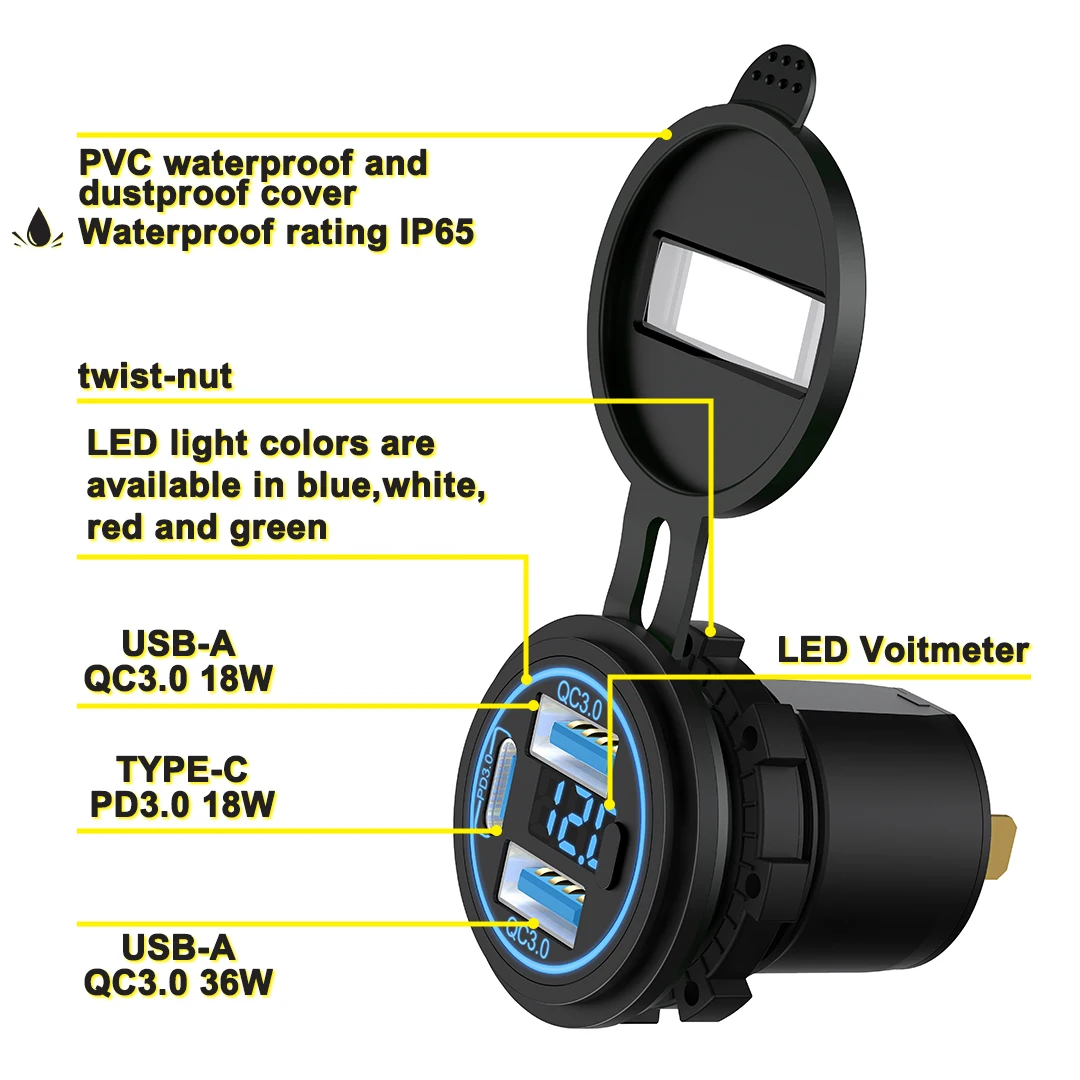 Product Description Product Overviews Function* Charging All Usb Devices: Including Apple And Android Mobile Phones Tablets,Laptop(High power 65W, 100W required),Etc Electronic Device. applicable scenarios* For Car ,Bus(Bus Seat,Bus Handrail), RV, Boat, Marine, Motorcycle, Trolley, Truck, Camper, Electric scooter, Electric Mopeds, Caravan, Motorbike, Moto, Auto, Automotive,Vehicle,Fleet,EV Scooter,Electric Bikes,,E bike,Campervan, Seat, Etc Other applicable scenarios* For Outdoor,Electronics System,Solar System,Furniture,Etc Certification* ISO9001 CE ROHS FCC REACH EMARK EMC Certificate Product Material* PC and ABS Input* 12V – 24V DC, Customized to requirements Output* 2 USB-A QC3.0 + Type C PD3.0 18W+18W+36W Mounting Hole Size* 29mm Usb Port* USB-A Type C – Tested To 10000 Mating Cycles Free Warranty* 12 Months Free Warranty Connections Input* blade terminals, 13Cm Cable (Customizable length) Connector* Multiple Conectors Optional ,Such As Tyco Molex,etc OEM ODM* Supported Services * Yes, Please Send Inquiry. 1. CKD parts shipment 2. PCB Circuit Board Design