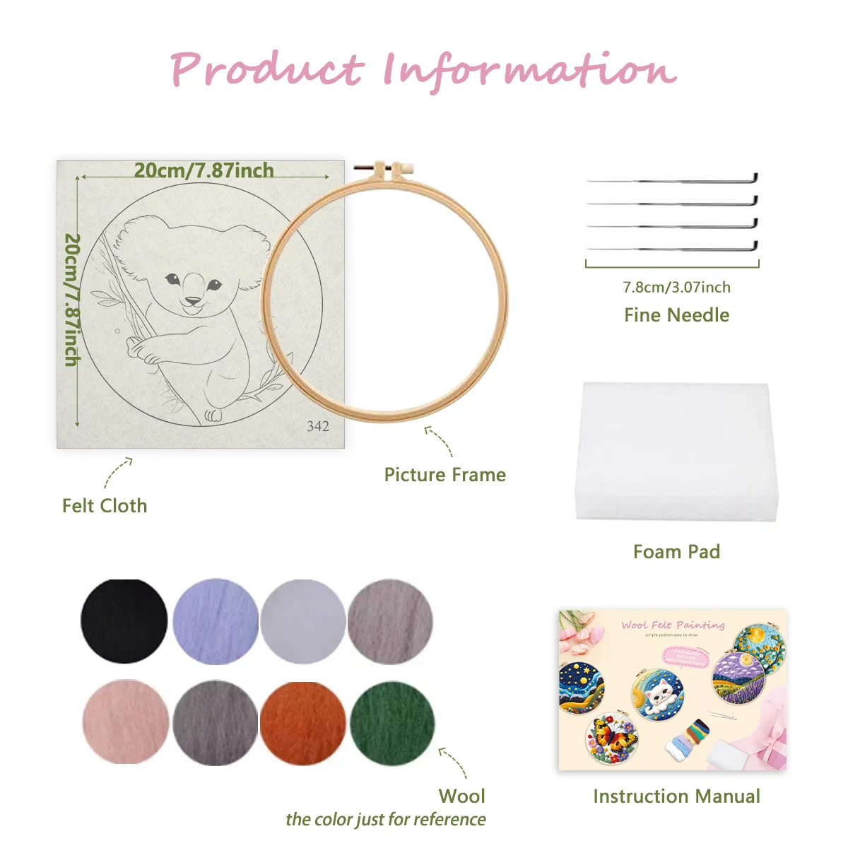 Usage reference+Multi Wools+1 pc foam workplace+ 3 pcs metal needle+frame