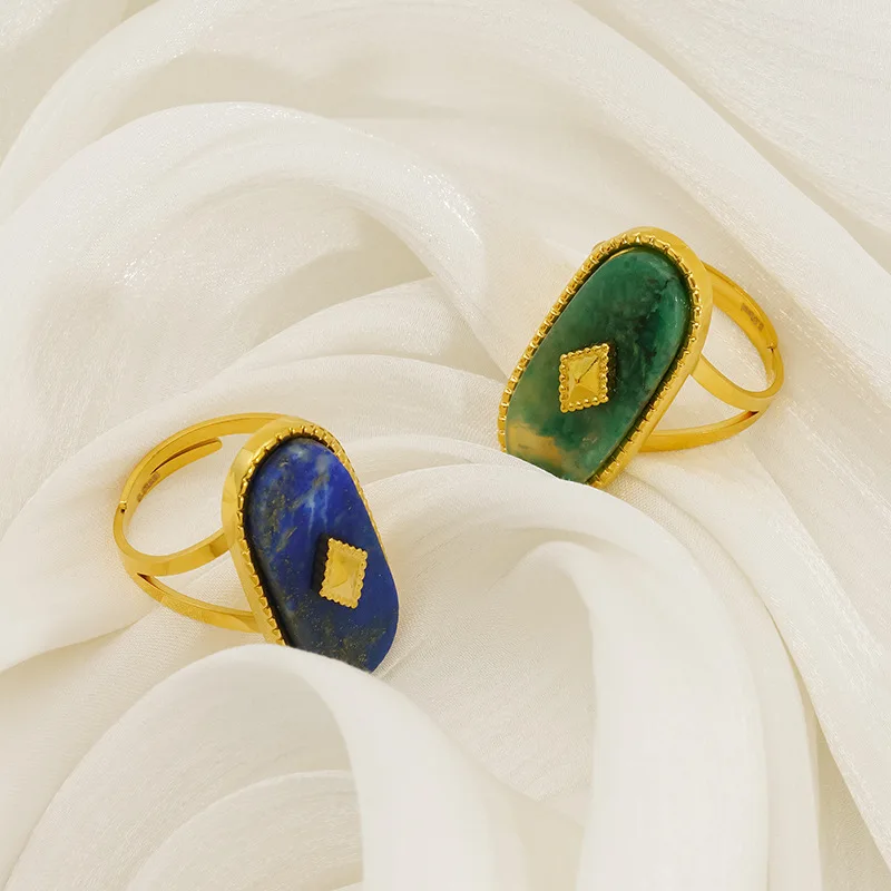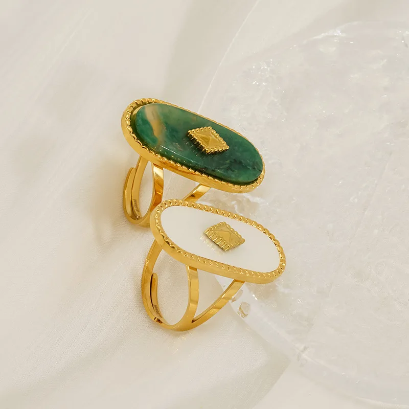 French Vintage Style Open Adjustable Ring 18k Gold Plated Stainless Steel Jade Inlaid Ring