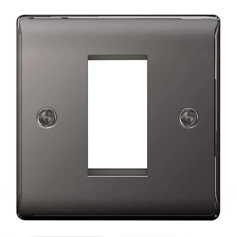 BG Nexus Metal Euro Module Square Front Plate with black nickel finish and manufactured to BS 5733 standards. It is quick and easy to install, this euro module is compatible with the wider Euro Module range of products. · · · Quick and easy to install · · Earth terminal fitted to metal front plates · · Compatible with the wider Euro Module range of products · · Assemble different configurations onto a single faceplate · · Manufactured to BS 5733 standards