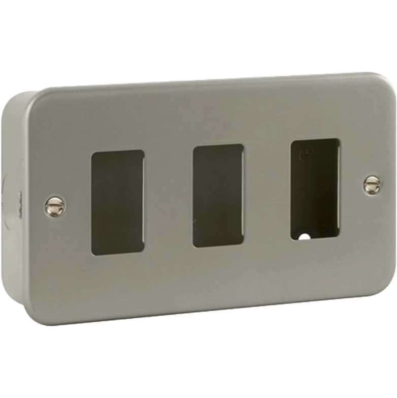 Scolmore International CL20403 GridPro Frontplate 3 Gang c/w Back Box Metalclad · · · Product: Cover Plate · · Gangs: 3 Gang · · Ingress Protection: IP20 · · Body Material: Steel · · Face Colour: Metalclad · · Fixing Centres: 120.6 mm · · Mounting Box Minimum Depth: 50 mm · · Length Min Max: 140 mm · · Height: 80 mm · · Width: 4.5 mm