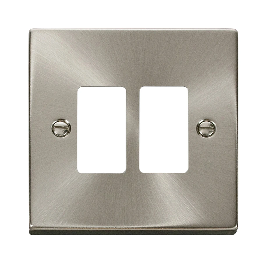 Scolmore Deco GridPro Front Plate with satin chrome finish. This product range is available in 8 finishes, a brand that is synonymous with high quality, long life, high specification and unprecedented value for money. · · · 2 gangs · · Satin chrome finish