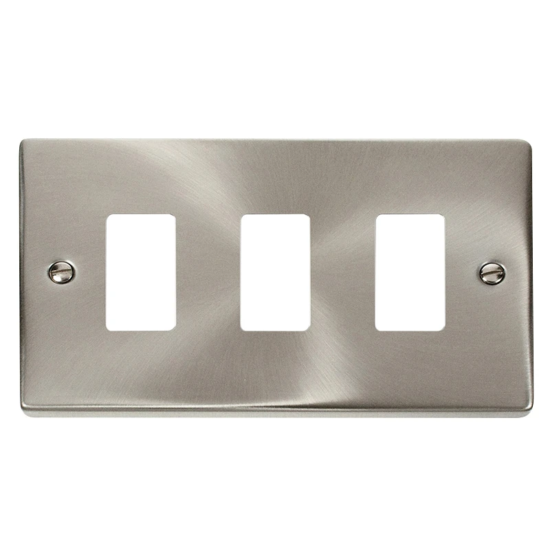 Scolmore Deco GridPro Front Plate with satin chrome finish. This product range is available in 8 finishes, a brand that is synonymous with high quality, long life, high specification and unprecedented value for money. · · · 3 gangs · · Satin chrome finish