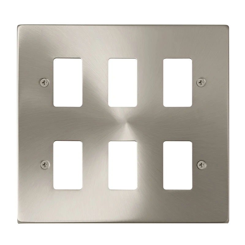 Scolmore Deco GridPro Front Plate with satin chrome finish. This product range is available in 8 finishes, a brand that is synonymous with high quality, long life, high specification and unprecedented value for money. · · · 6 gangs · · Satin chrome finish