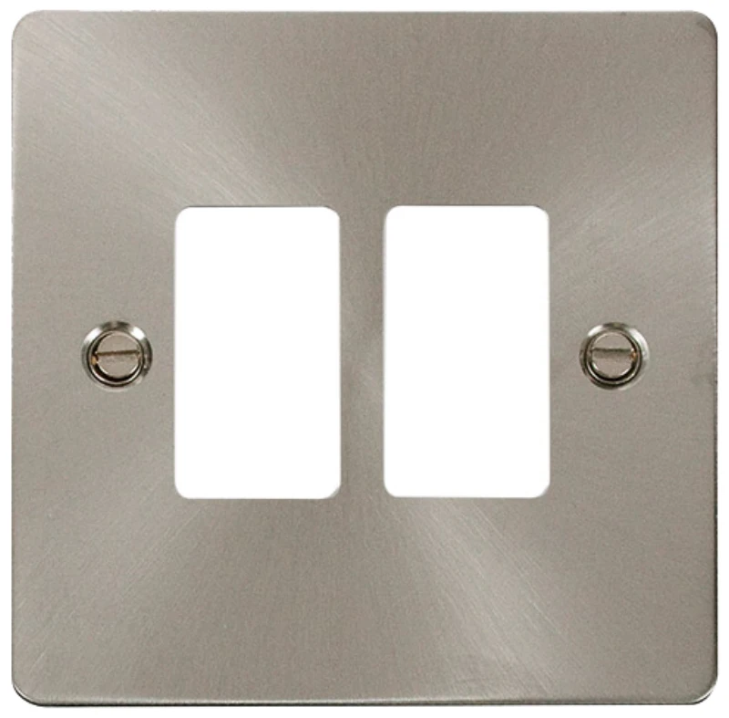 Define flat plate brushed stainless 2 gang gridpro frontplate. · · · Dimensions 86mm (W) x 86mm (H) x 1.3mm (D) · · Plate Design & Finish Flat Plate Brushed Stainless · · Front Plate: Stainless Steel · · Plate Fixing Centres 60.3mm · · Back Box Depth 35mm Minimum · · Operational Temperature -5°C to +40°C · · Warranty 10 Years