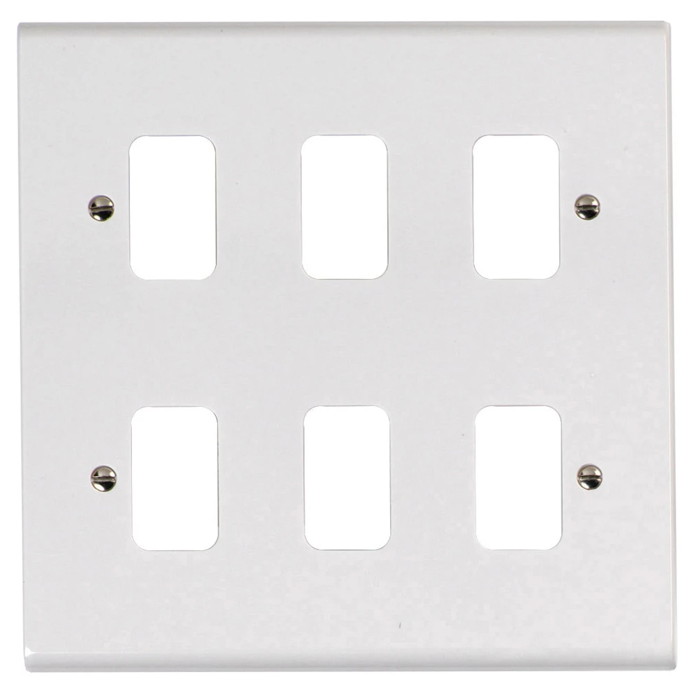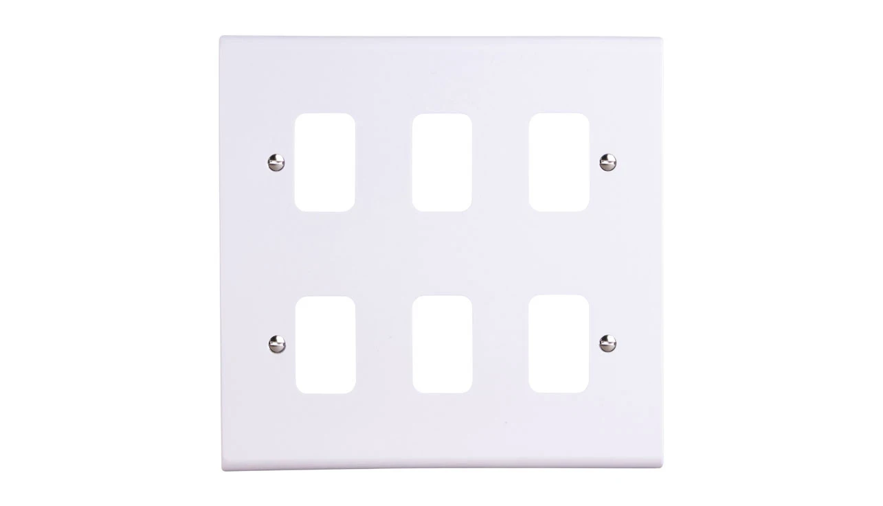 · · Unique slim profile with curved top and bottom edges and fixing screw cap covers · · A comprehensive range of front loading, snap-in gridswitch modules are available · · Grid frames are supplied separately · · Fixing screws are supplied in high visibility bags, attached to rear of plates to prevent scratching · · BS 5733 · · 25-year guarantee