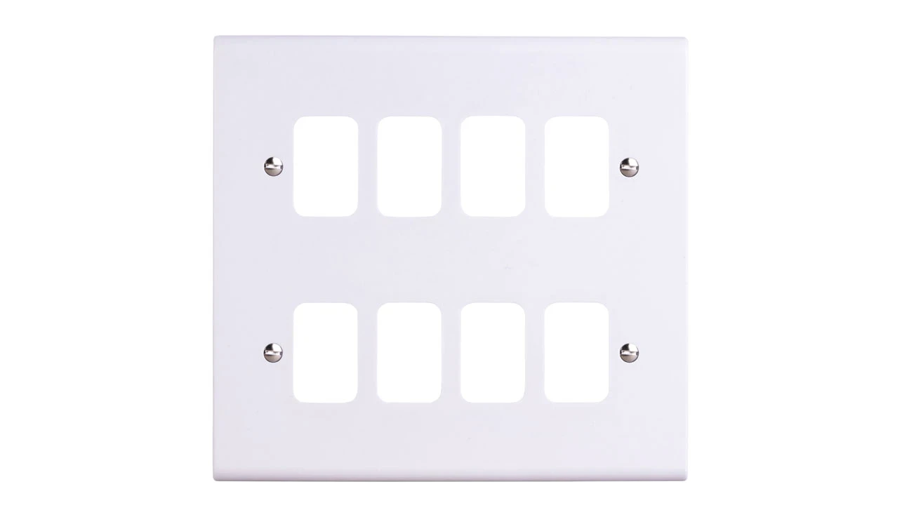 · · Unique slim profile with curved top and bottom edges and fixing screw cap covers · · A comprehensive range of front loading, snap-in gridswitch modules are available · · Grid frames are supplied separately · · Fixing screws are supplied in high visibility bags, attached to rear of plates to prevent scratching · · BS 5733 · · 25-year guarantee