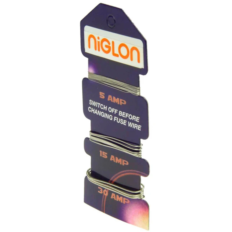Niglon FWC30 is a Fuse Wire Card with 5A/15A/30A Fuse Wire · · · Suitable for R5/R15/R30 fuse wire. · · Wires segregated and labelled correctly for easy selection · · Card contains Wire Length 1mtr of each 5A/15A/30A · · Material: Tinned Copper · · Rated: 230V
