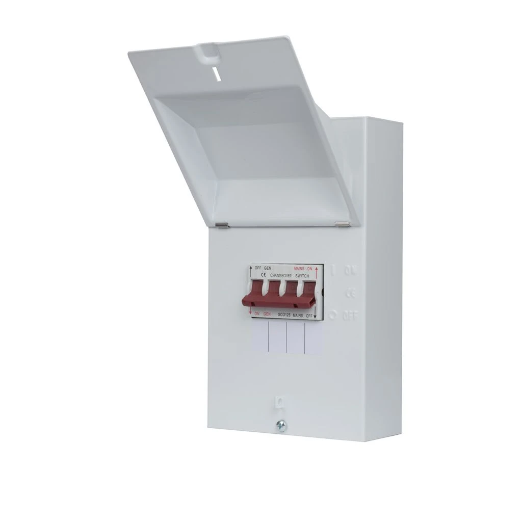125A 1 pole + neutral changeover switch in fully metal enclosure. Used for switching between mains and standby generator.It has cable entry points positioned on the top and bottom to allow for tails to be taken in and out with ease. · · · 125A · · Multiple fixing points · · Cable entry at top and bottom · · H:260mm x W:156mm x D:92.5mm