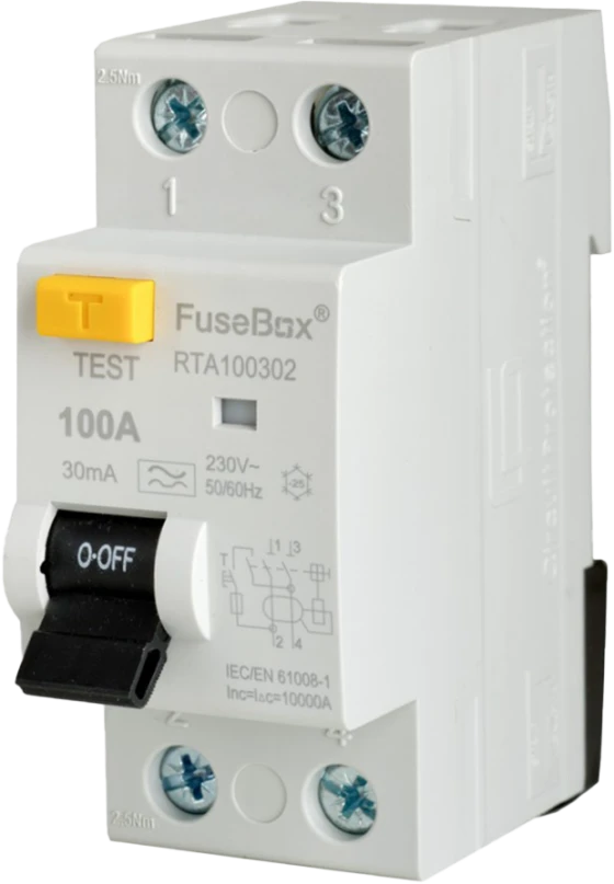 The FuseBox is Type A 100A 30mA Double Pole RCD (residual-current device).Suitable for use in FuseBox consumer units. · · · Number Of Poles 2 Pole · · Rated Voltage (Un/Ac) 230V · · Frequency (Hz) 50/60 · · Rated Breaking Capacity 6000A (6kA)