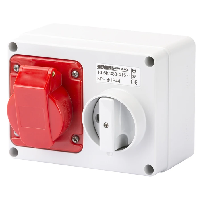 Technical Specifications  Technical Specifications CEE switched socket outlet Degree of protection (IP rating) IP44 Model Base unit and cover Voltage acc. EN 60309-2 380-415 V (50+60 Hz) red Identification colour Red Number of poles 3 IEC-amperage 16 A Clock hour position 6 h