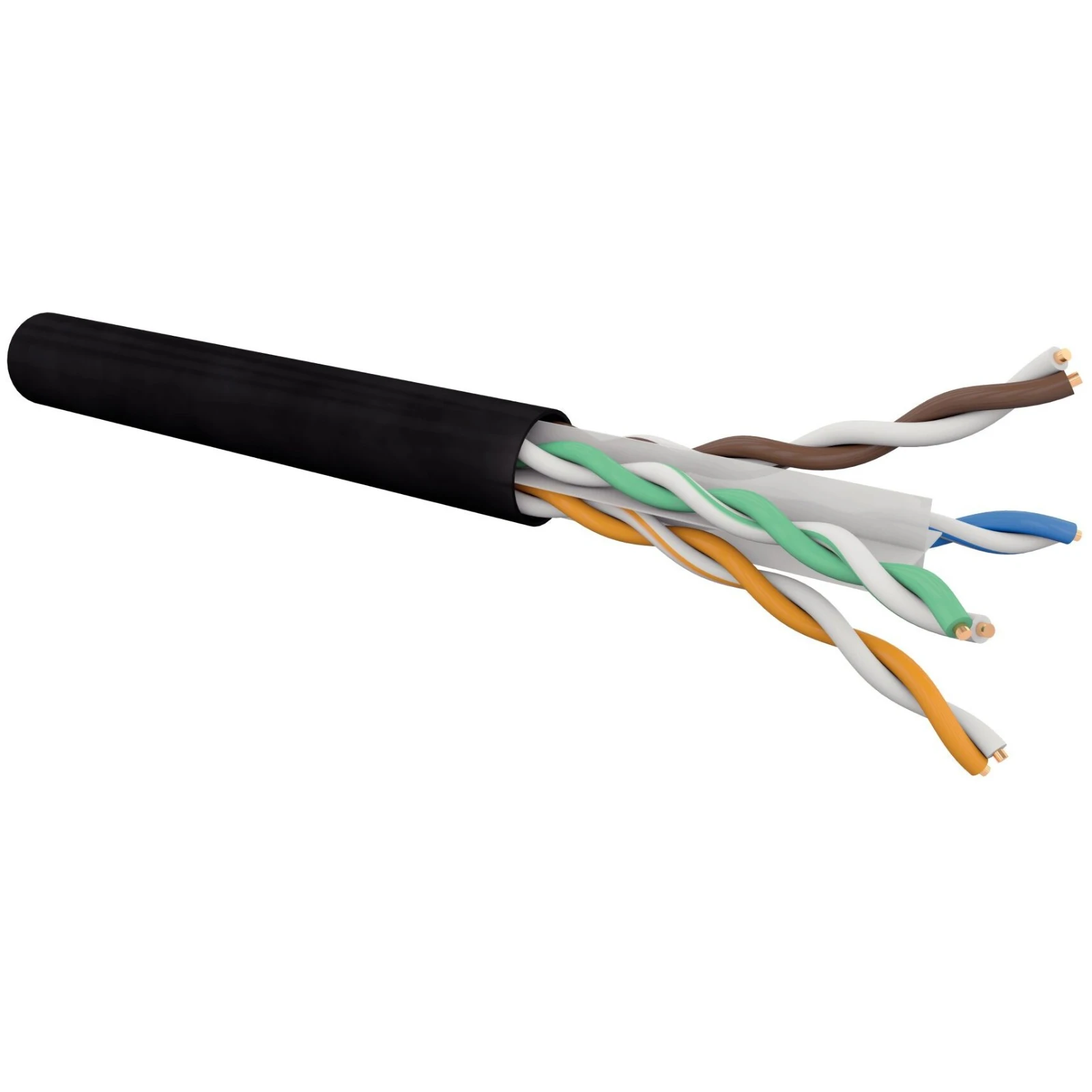 The outer PE sheath ensures superior UV resistance, ideal for outdoor installations. The PVC/PE versions may also be used indoor if the outer PE sheath is removed. · · · Packaging: 305m drum · · Complies with standards: EIA/TIA 568-C.2 ISO/IEC 11801; IEC 61156-5; EN50173; EN50288-6-1 · · Applications: IEEE 802.5 16 MB; 10Base-T; 100Base-T; 1000Base-T · · Sheath colour: black, RAL9005 · · Outer sheath diameter: 6.3 mm · · Frequency range: from 0 to 250 MHz · · Impedance characteristics: 100 O · · Sheath: PE · · NVP: 67 % · · Conductor copper gauge 23 AWG