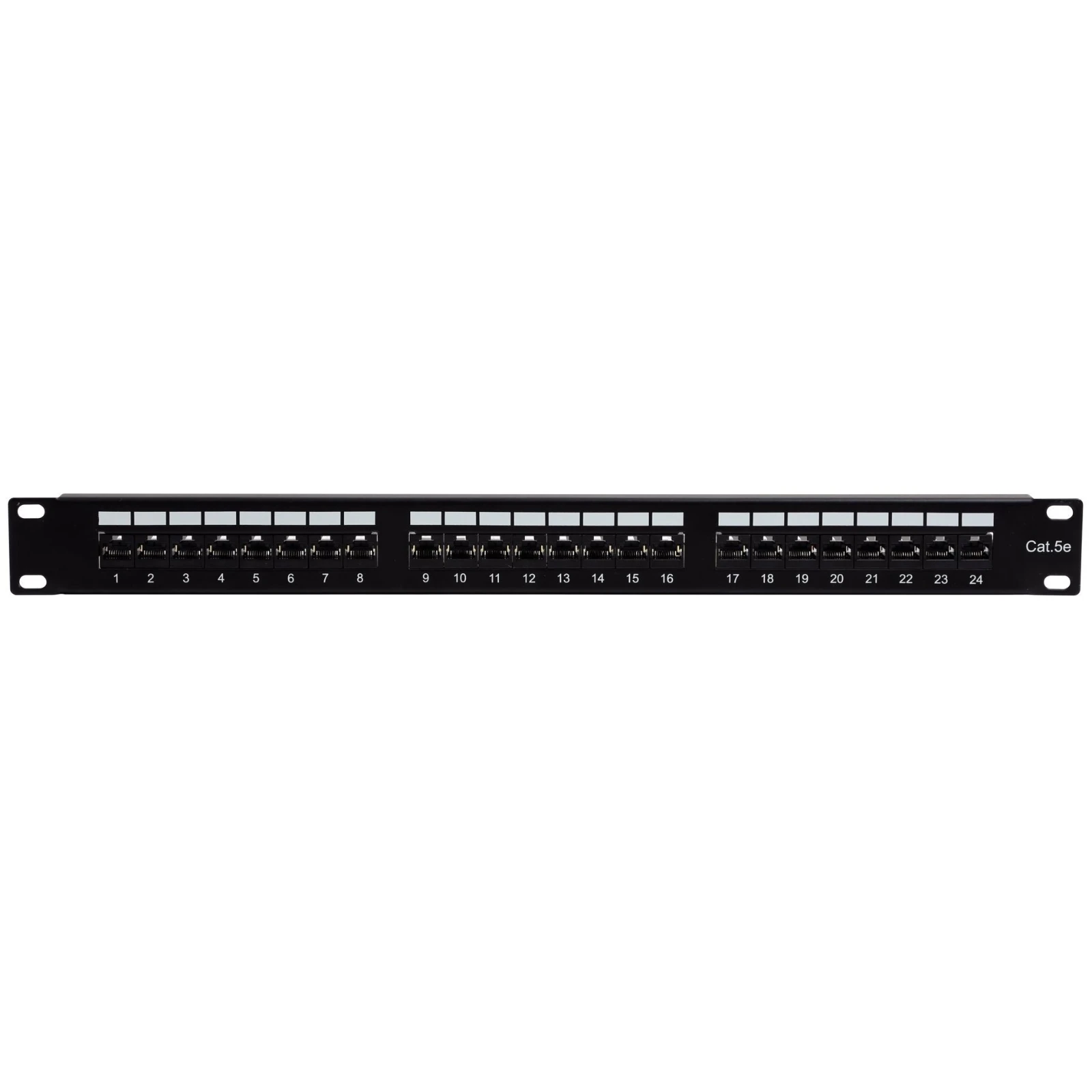 Efficient CAT5e UTP Panel for termination of up to 24x Links equipped w 90 degeres IDC blocks · · · Mounting method: 482.6 mm (19 inch) mounting · · Colour: Black · · Width: 482.6mm · · Height: 44.45mm · · Depth: 45mm · · RAL-number: 9005 · · Connection type: 110 · · Screened: no · · Category: 5E · · Type of connector: RJ45 8(8)