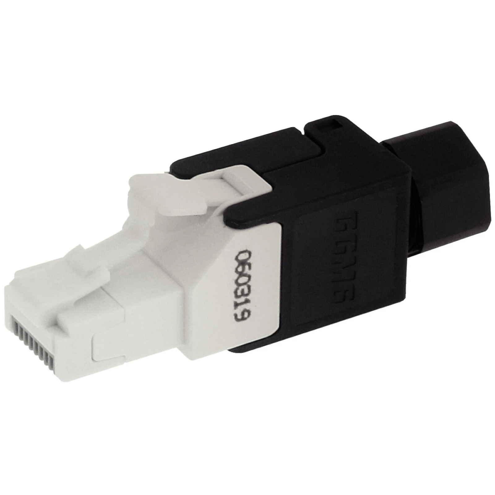 CAT6 RJ45 IP20 field plug for solid cable (23/26AWG). Suitable for all applications up to 5GBase-T. Tooless termination without crimping. Ideal for installation of CP links. · · · Class E, 1 000Base-T, 2.5GBase-T, and 5GBase-T · · UTP · · AWG23/1 – AWG26/1 · · Maximum cable diameter: 6 mm · · Cable held by cable gland