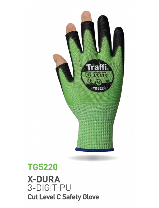 A lightweight cut index C glove compliant to EN388:2016. Features 3 exposed fingertips for improved dexterity and the PU coating offers excellent grip in dry conditions. Close fit and high tear and abrasion resistance makes this glove a good choice for general handling tasks with a cut risk. · · · Level C cut protection · · 3 open fingertips for enhanced dexterity and detail tasks · · Durable X-Dura PU coating · · Lightweight and breathable liner · · Lengths: 220-270mm · · Liner: Nylon/HPPE/Glass