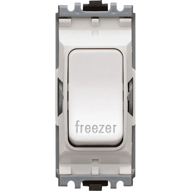 The switch module features easy to fit and change, simply clip into place from the front of the mounting frame. The grid module clips to the frame without any requirement for special tools. It can be moved, removed or replaced whilst the frame is fitted to the box making installation or replacement speedy and simple. The simple clip fit mechanism holds to the mounting frame in order to place from the front. This switch does not have to be derated when used with fluorescent or inductive loads and is manufactured according to BS EN 60669-1:1999 standards. · · · Current rating 20A · · No. of gangs 1 · · No. of ways 1 · · No. of poles 2 · · Switched/Unswitched: Switched · · Voltage 230 V · · Legend Freezer · · Rocker Colour White