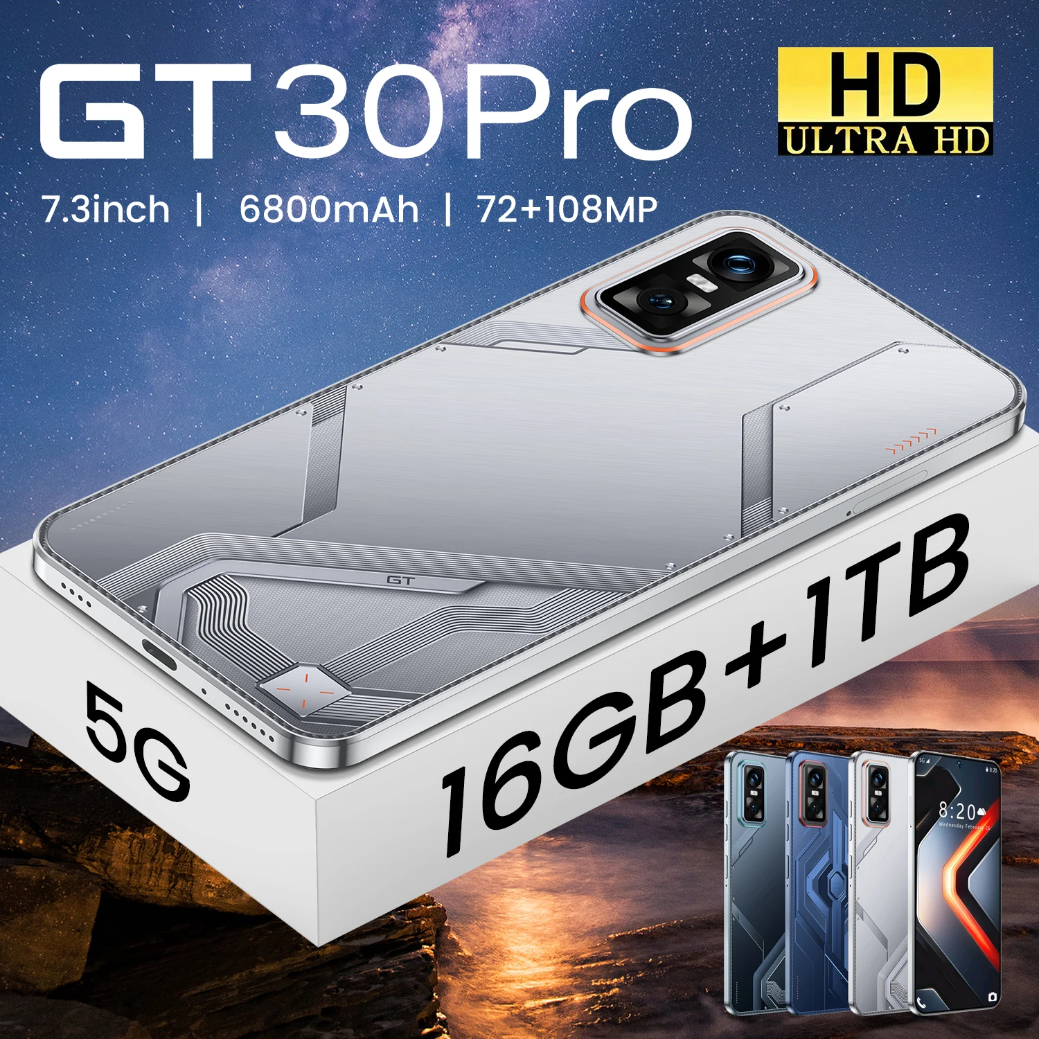 GT30 PRO 5G Cellular Smartphone 7.3 Inch HD Screen 6800mah Battery 108mp Rear Camera Deca Core CPU 16gb RAM CDMA/LTE